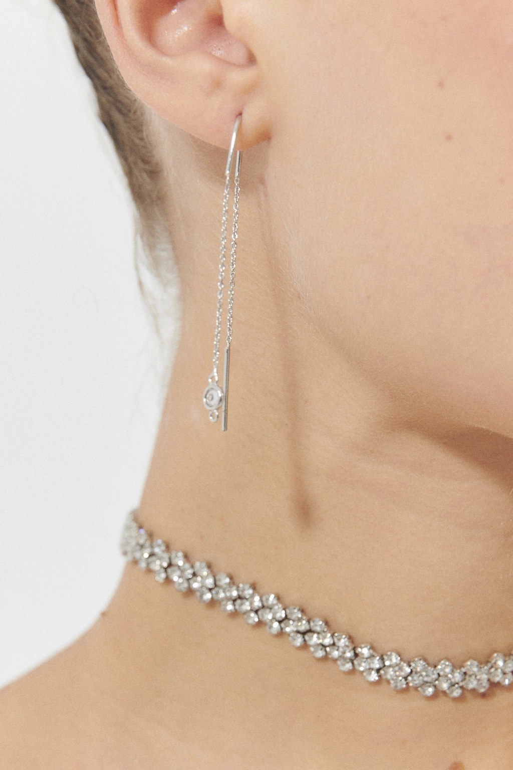 Los Aros Leia se deslizan, no se abrochan. Una fina cadena bañada en plata 925 atraviesa la oreja sin cierre, dejando caer dos extremos asimétricos que se balancean con cada movimiento. En uno de ellos, una zirconia aporta un destello preciso. Liviano, fluido y poco convencional, es un pendiente que no se impone, pero no pasa desapercibido.