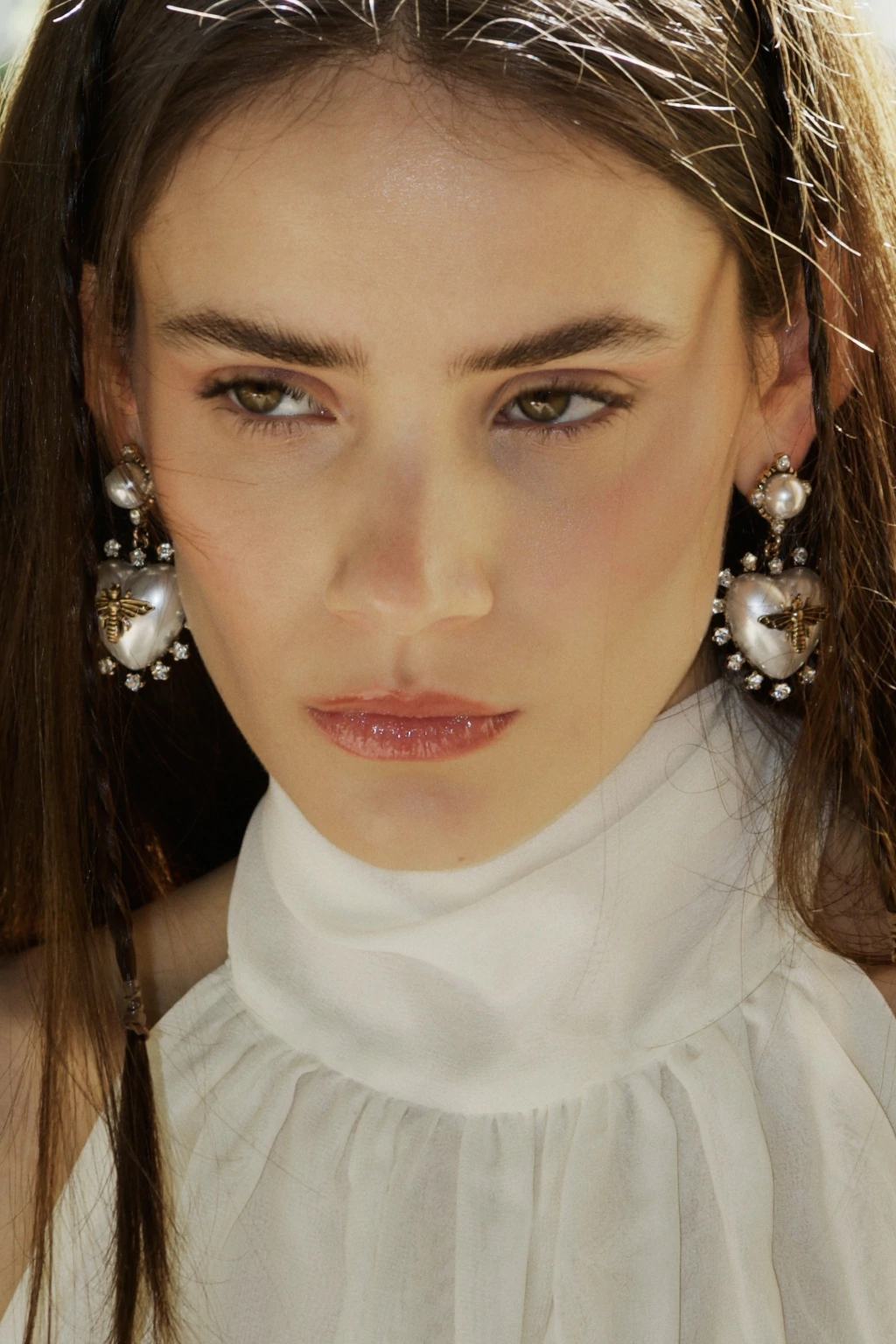 Un diseño que combina lo romántico con lo simbólico. Los Néctar tienen como centro un corazón perlado coronado por una abeja dorada, rodeado de cristales que aportan brillo y presencia. Su forma colgante y los detalles en contraste logran un equilibrio entre lo clásico y lo llamativo, convirtiéndolos en una pieza que destaca con personalidad y encanto.