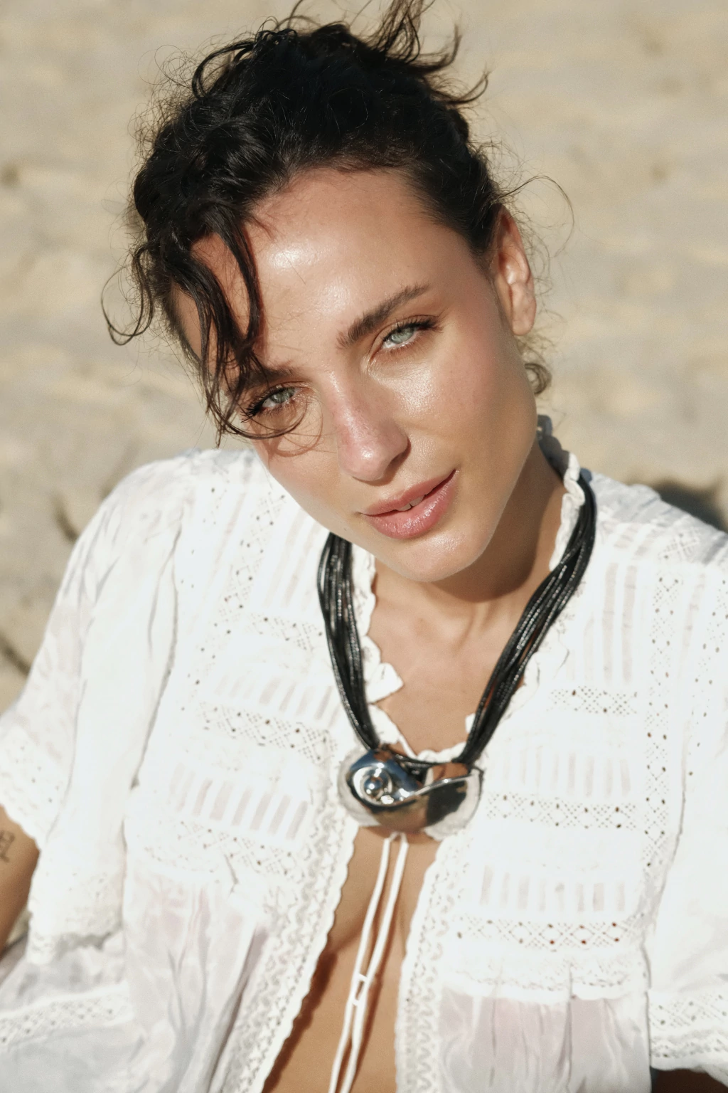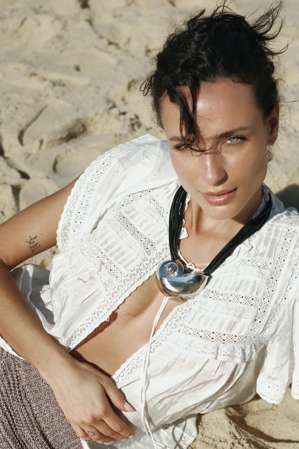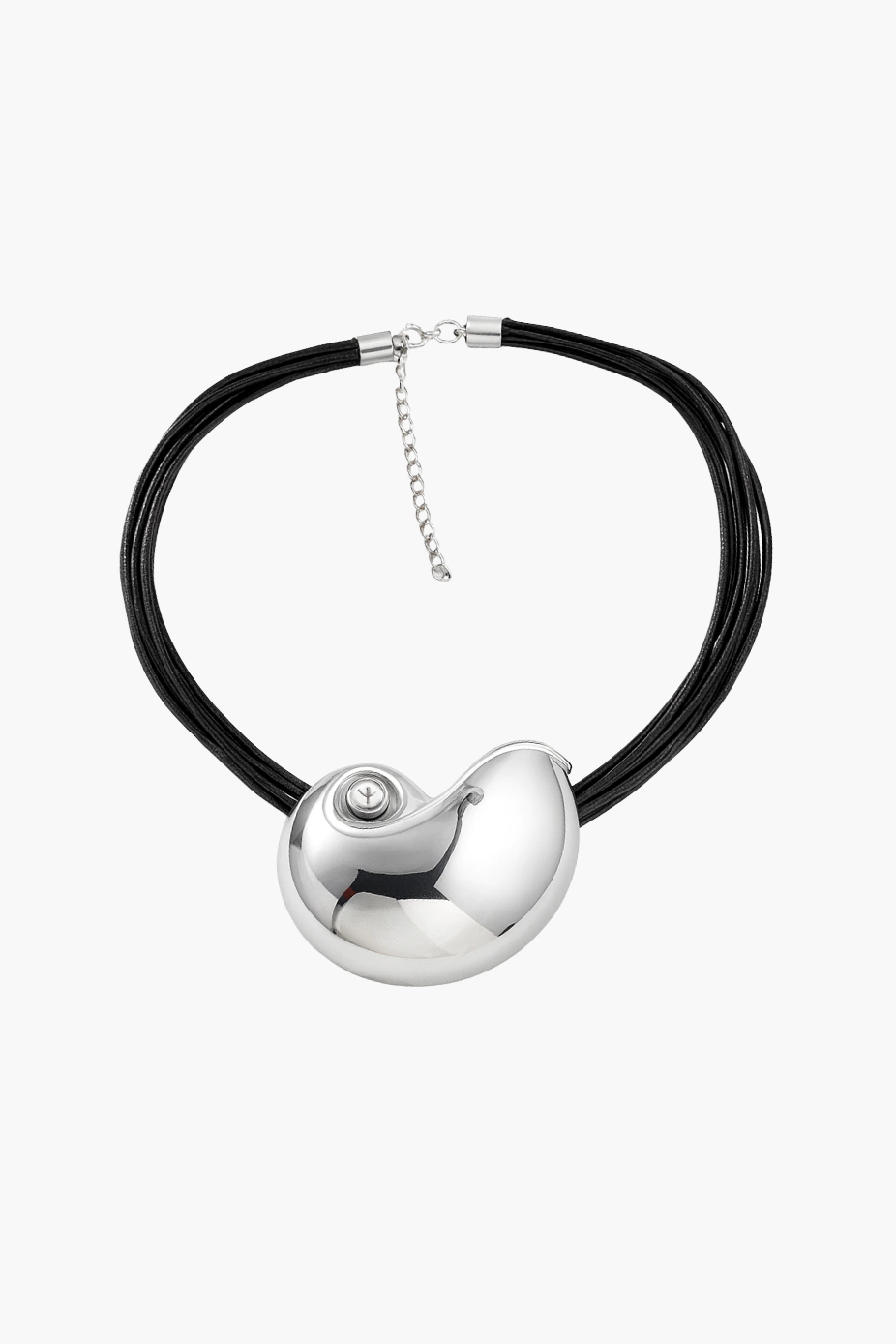 El Calypso es una declaración de fuerza y fluidez, como una ola detenida en el tiempo. Su imponente dije metálico en acabado espejo refleja la luz y el entorno, convirtiéndose en un amuleto contemporáneo y marino. Acompañado de múltiples hilos oscuros que abrazan el cuello, la pieza juega con contrastes. Es un collar que no se lleva en silencio: habla de presencia, magnetismo y elegancia indomable.