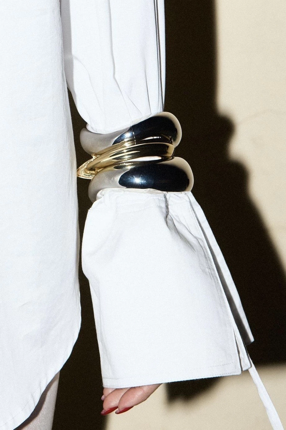 Gruesa, fluida y perfectamente pulida. La Dafne tiene una silueta curva que envuelve la muñeca como un gesto continuo, sin principio ni fin. Su volumen la convierte en protagonista, pero su superficie espejada le da un aire silencioso, casi escultórico. Disponible en plata y oro, es una pieza que no se impone: se afirma.